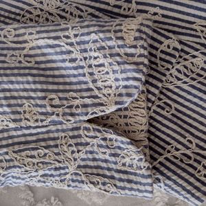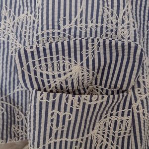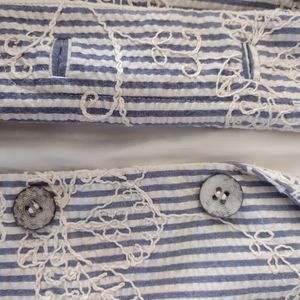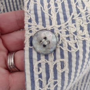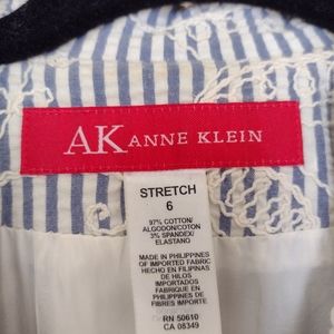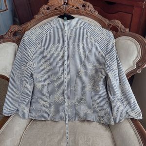 EUC Anne Klein slightly cropped blue and cream striped seersucker jacket has so many cute details. Allover cream colored embroidery, carved shell buttons, 3/4 length sleeves with tulip cuffs and notched lapels. It's fully lined with acetate lining. Size 6. Perfect for Spring!