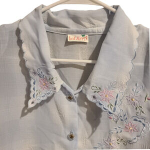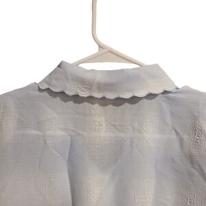 Light blue textured sheer button down top with scalloped collar, floral embroidery and cut outs. Shoulder pads that can easily be removed. Gorgeous clear plastic and gold metal buttons. Lightweight.