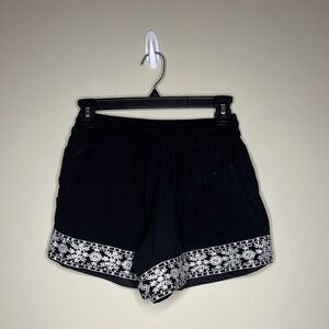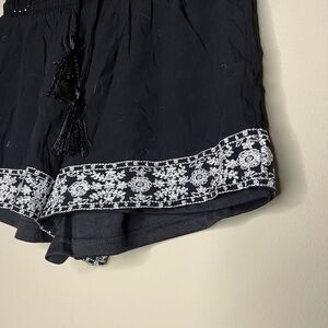 Black fabric shorts with white embroidery along the hem. Tassels at drawstring. Pockets at both hip. No flaws. Size small.