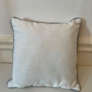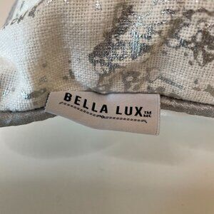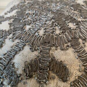 This fun accent pillow by Bella Lux showcases an embroidered snowflake ❄ in gray thread, silver thread, and silver beads. The cover is in a soft, white linen and/or cotton with a metallic silver mottled pattern with a metallic silver piped edge. It is overstuffed. It is clean and odor free. The cover cannot be removed. It is just perfect to add a little winter holiday cheer. Size: ~11.5" x 11.5"