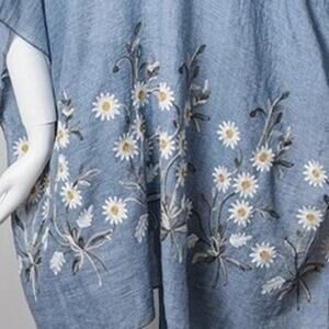Embroidered Spring Daisy Woven Kimono Wrap Shawl Boho Floral Blue Chambray