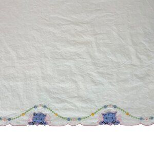A charming vintage tablecloth or runner with detailed embroidery of blue cats, floral garlands, and scalloped edges. Ideal for adding a whimsical touch to decor.
