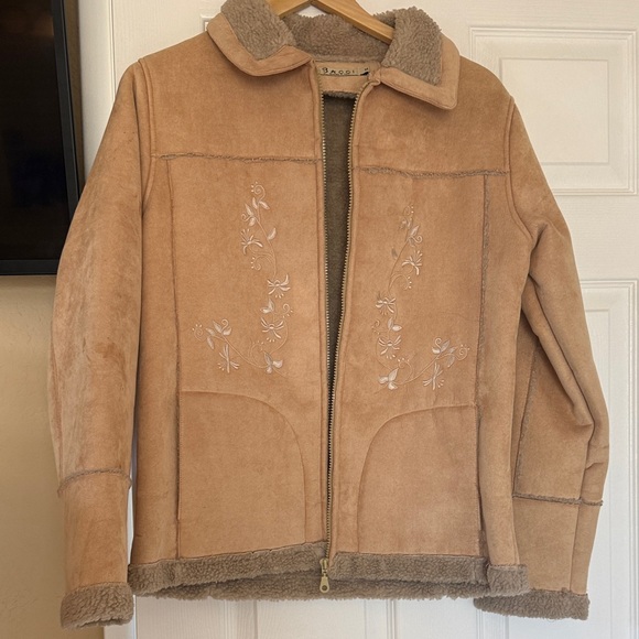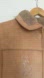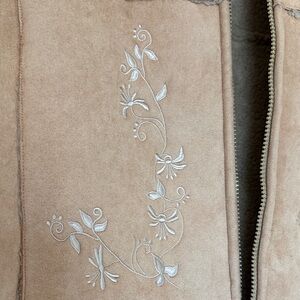 Elevate your wardrobe with this elegant tan shearling leather jacket, featuring delicate embroidery for a touch of sophistication.