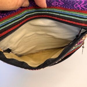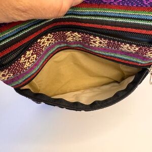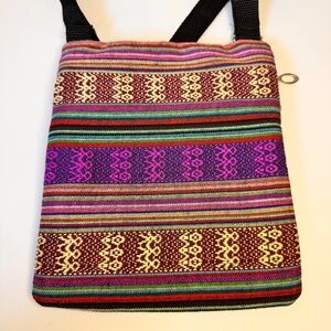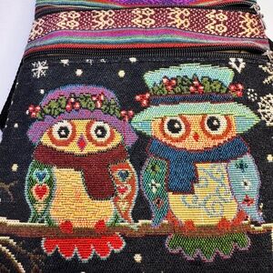 This Embroidered Tapestry Bag features a charming Owl design, with a pair of owls on the front. It has 2 exterior zippered pockets, an adjustable strap, and a zipper closure. The bag is medium-sized and made of a cotton/poly blend exterior with a fabric lining in beige. The handle/strap color is black, and the overall exterior color is multi-color. Perfect for owl lovers who appreciate functional and stylish accessories.