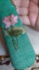 Elegant green glasses case with floral embroidery. Features a pink flower design.
