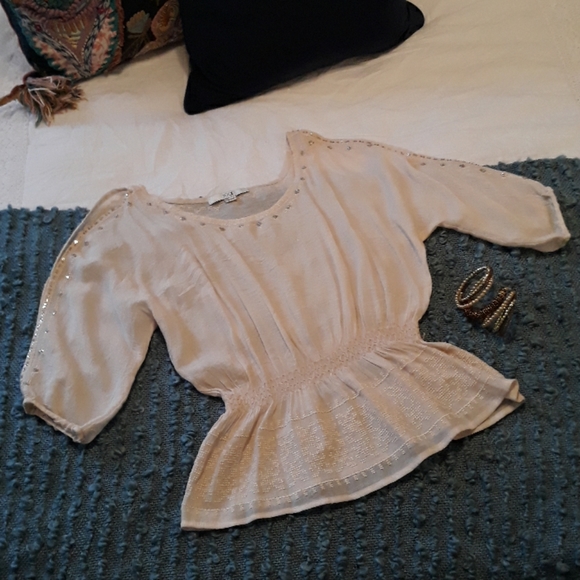 Cream colored embroidered & lightly beaded. Slitted 3/4 sleeves. Elastic embroidered waist.💫 Bundle & Save 💫