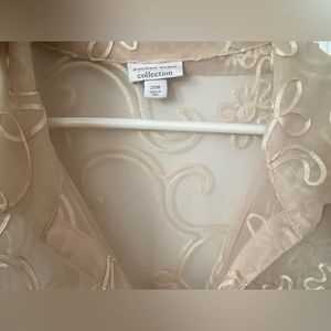 Loose fitting, embroidered cream top. The sleeves and bottom hem are scalloped, which adds to the beautiful flow of the shirt.
