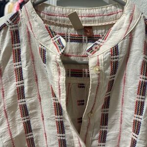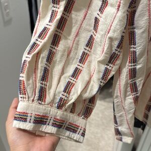 Pilcro embroidered cotton blouse, cream base with multicolored embroidery running down the length of the shirt and along the sleeves. Versatile and can be worn with pants or skirts, never worn.