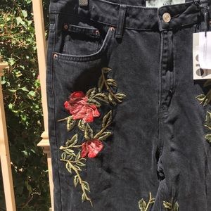 Super cute dark grey mom jeans with rose embroidery from Top Shop. I got these as a present but never wore them because they're sadly a bit too big on me, so they have all original tags still attached. They were originally 110 dollars!!