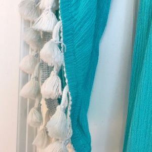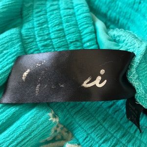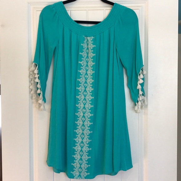 Medium tunic (possibly mini dress) in teal with cream embroidery and tassels on the sleeves. Can be on or off the shoulders. I cannot tell from the tag what the brand is. Dress is rayon and lining is polyester. Worn twice.