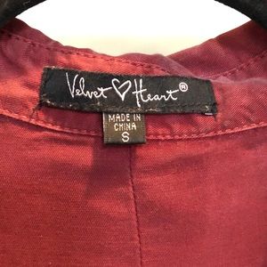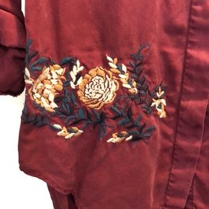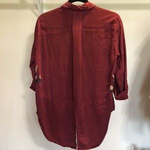 Maroon colored button shirt with beautiful black and cream floral embroidery on the front and split tails in the back