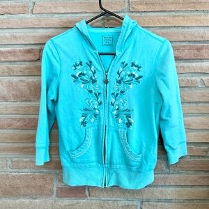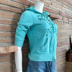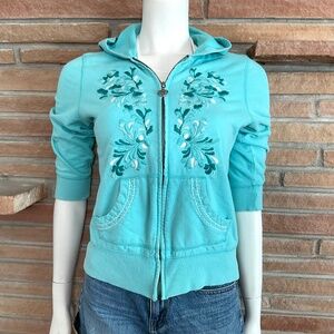 Pretty turquoise blue zippered hoodie with embroidered front and metal heart zip pull. Size petite small, from Three Hearts. Great condition with light wear and tiny hole on left front (see photo)