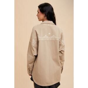 This In Loom Embroidered Utility Snap Shacket Shirt Jacket is a must-have for anyone who loves the Aztec pattern and wants to add a touch of Western style to their wardrobe. Made of a comfortable blend of cotton and spandex, this shirt jacket features long sleeves and a snap closure, making it perfect for any occasion, whether it's a casual day out or a party. The tan, khaki, and almond colors give it a classic and timeless look, while the embroidered accents add a touch of elegance and sophistication.