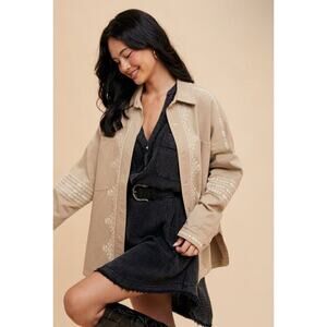 This In Loom shirt jacket is a must-have for any fashion-forward woman. The snap closure and long sleeves make it perfect for any occasion, whether you're traveling, going to a party, or just running errands. The cotton/spandex material ensures a comfortable fit, while the embroidered accents add a touch of elegance.