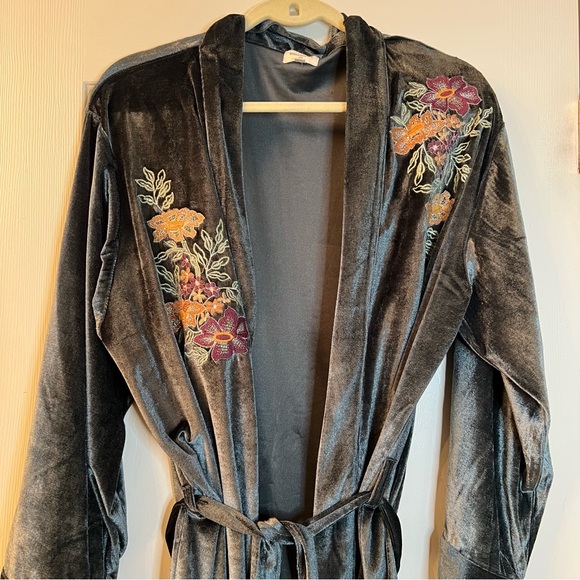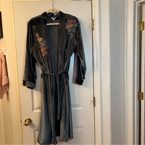 Elegant velvet robe with colorful floral embroidery. Soft and stylish for any occasion. Fits up to 2 X womens