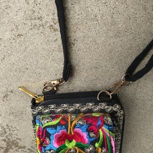 Colorful embroidery on black. Front pocket 6 x 3.5" with flap that snaps. Zippered body 7.5 x 4 x 0.75". Inside, 3 main compartments, one with zipper, and 8 card pockets. Removable strap 50" length. NWOT