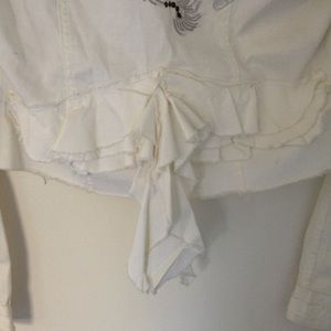 100% cotton, vintage, distress on ends of ruffles, embroidery of birds and feathers