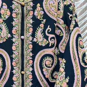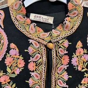 I love this black base wool jacket with beautiful multi color embroidery detail, colorful buttons, and ruffle bottom. It is in excellent condition with no pulls on embroidery noted. It has a beautiful fabric drape while still looking structured. Such a gorgeous statement piece!