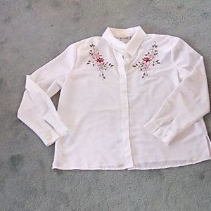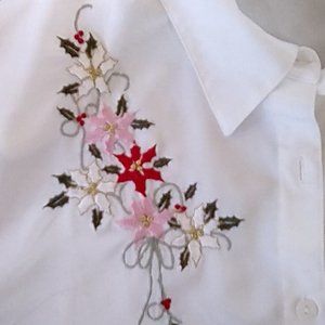 Very merry button white down shirt with embroidered Christmas flowers & holly by Blair. 100% easy care polyester. Size Medium