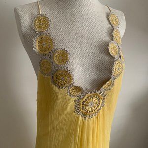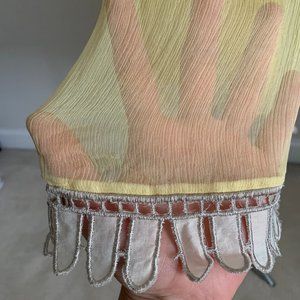 I wore this only once and i'm so sad to part with it, but it's just not my color. There are several minor imperfections you can see in photo 3 & 4. They are not detectible when wearing but want to be up front. This dress is 100% silk on the outside and the lined inside. Offers welcome.