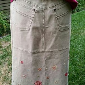 The perfect skirt for ladies who seek attention! ?●Beautiful embroidery of different colors, tiny beads and buttons, and clear sequined hem adorn this tan colored skirt. Front slant pockets, two back pockets with stitching detail. Side zip with hook and eye closure.