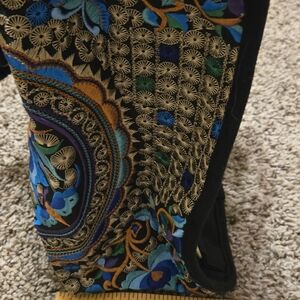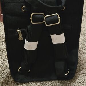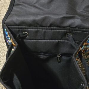 Embroidered backpack that has an inner lining to the bag. With a snap closure, this satchel style has a wide printed fabric strap, an interior zippered pocket, and is accented by bronze-tone hardware. Wear it by adjusting the shoulder strap to your desired length.