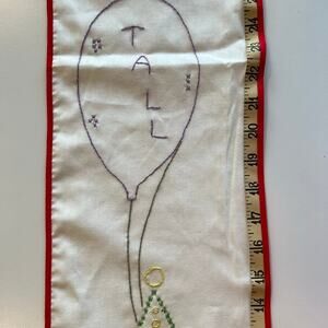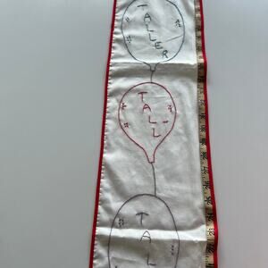 Tall Tall Taller growth chart with a clown at the base. Has a thin red border and a tape measured up the right side to measure a child’s growth! Has small pin hole and bottom where it was hung. Top left red border has some separation about 1/4” but holds together well. A nice vintage piece. Has not been washed or ironed. Please review photos for current condition of this vintage item.