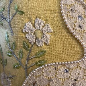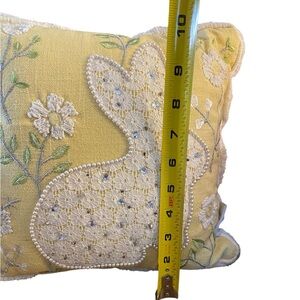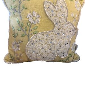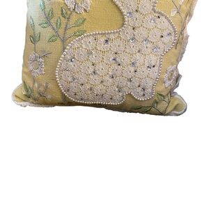 Charming yellow pillow with a floral bunny design. Features intricate embroidery and beadwork. 10x10 has tagger tiny hole in corner some pulling of embroidery