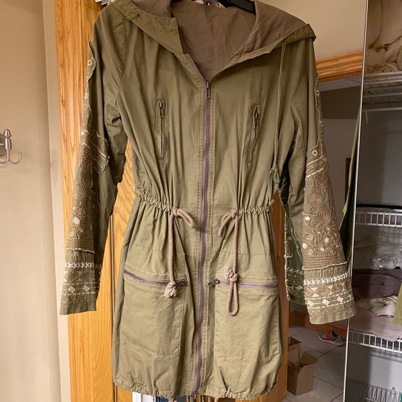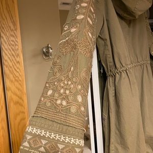 NWOT Olive green/army green jacket, great for spring or fall. Beautiful embroidery on sleeves. Adjustable waist & bottom. Fits like a size small