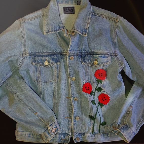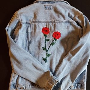 Jean jacket with embroidery flower details on front and back of the jacket, the jacket doesn't have any holes or stains, BUT is missing one button of ONE OF THE SLEEVES. I bought it like that and I didn't want to return it because they didn't have it no more. Other than that the jacket is in perfect condition, feel free to ask me any questions :)