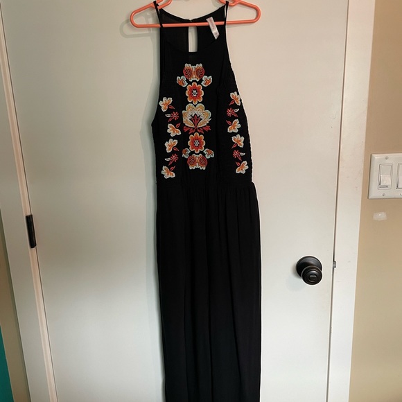 High neck black jumpsuit with floral embroidery. Size XS but could easily fit a small or smaller medium. Hits about mid calf. Xhilaration from Target