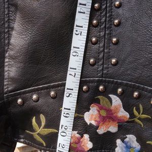 Beautifully detailed embroidered black leather studded jacket. Sized as L, but runs small. More small/medium since made in China. Never worn, still has tag. Length 21", side buckle accents.