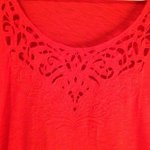 60% cotton, 40% polyester. Lovely detailing around neckline. Machine washable. Like-new.