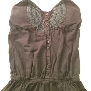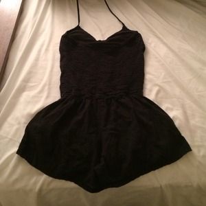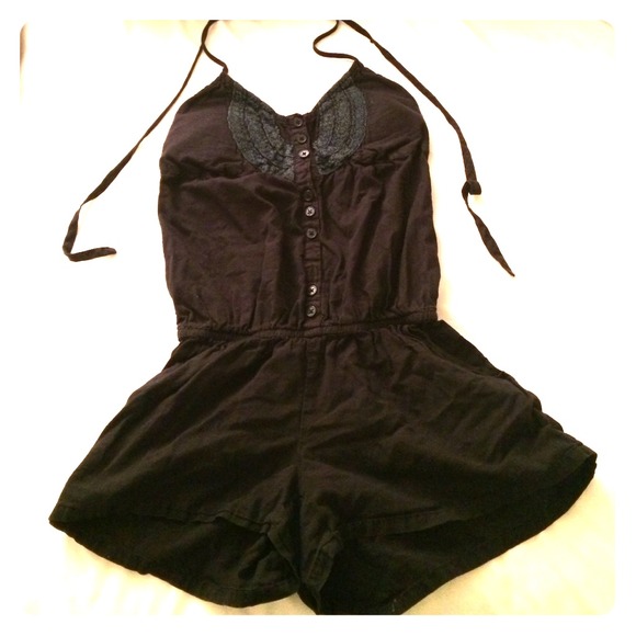 Super cute button up romper with padding on the chest and a kind of crochet pattern on front. Halter top tie and elastic back. Also has two decent pockets on each side! Made in India.