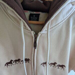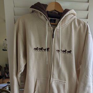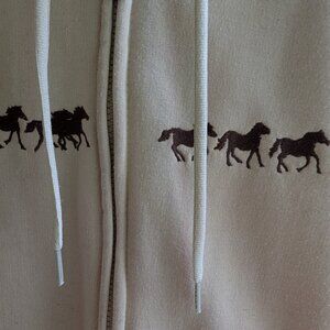 Cream and brown sweatshirt with embroidered horses. Good pre owned condition. 20.5 " pit to pit 25.5" shoulder to hem approx