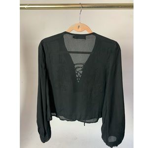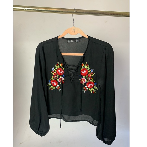 Super cute embroidered peasant top with tie up front. Throw on with some jeans and go!