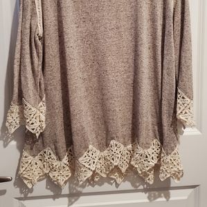 Great embroidered boutique blouse, tan with cream embroidery, ties can adjust how covered you want to be. Tag says 2X, fits like a loose fit XL.