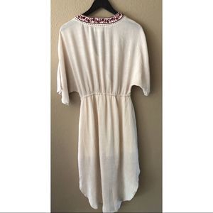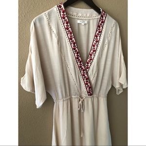 Light and airy! Perfect for the warm days. This kimono sleeve midi dress features a surplice front with intricate embroidered detail. Snap closure. Elasticized waist with drawstring tie. Vented sides. Partially lined. Gauze like material.