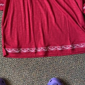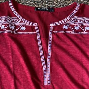 Embroidered red tunic, 3/4 length sleeves, v neck. Never worn. Lightweight fabric