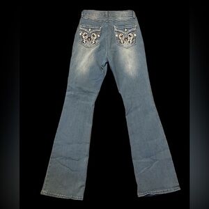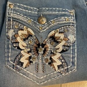 Stylish women's blue jeans featuring intricate embroidered pockets. Perfect for a casual yet chic look.