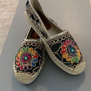 With a beautiful embroidered upper design, Patrizia's Maylis Loafer will kick your style up a notch. Embroidered detail Mixed materials Rope wrapped platform Soft textile lining Soft textile insole 1" platform.
