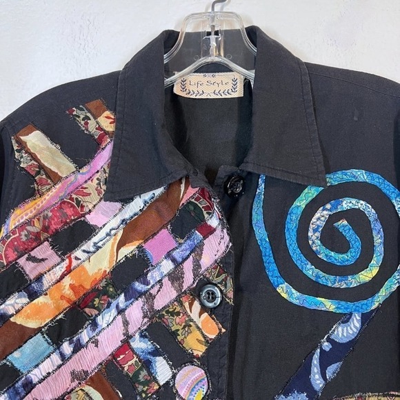 Patchwork Embroidered Jacket Black Button Down Small Cotton