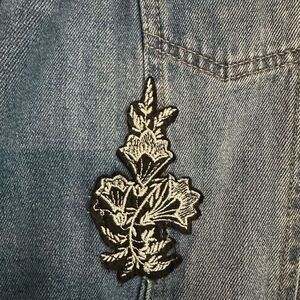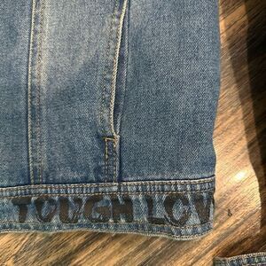 The front of the jacket On the right chest area, there's a small, embroidered patch with a floral design. The left sleeve text "Respect me, I am a Lady" The back hem also features a subtle "TOUGH LOVE". This jacket is perfect for adding an edgy yet feminine touch to any outfit.