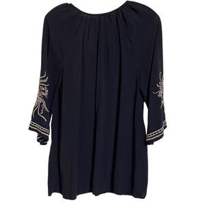 Nice quality. Lightweight. Beautiful embroidery. I'm pretty sure this is a very dark navy, but it could be black.