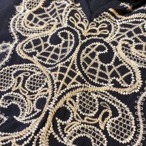 Nice quality. Lightweight. Beautiful embroidery. I'm pretty sure this is a very dark navy, but it could be black.