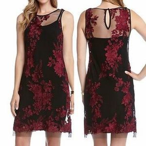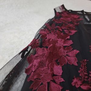 Elegant floral embroiderery adds stunning detail to a sleeveless tulle dress with a black slip lining that snaps together at the shoulders ❤