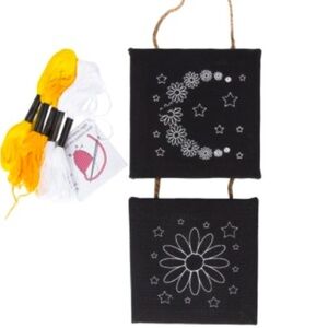 • includes 2 hanging canvases on a rope with designs to embroider, 5 colors of embroidery thread, 1 sewing needle, 1 instruction sheet