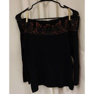 Embroidery and Beaded Black Top Lillic Rubin. Off-the-shoulder top. Approximate Measurement: Chest pit to pit: 17" Length 18.5" 3/4 Length 56% Nylon 46% Rayon