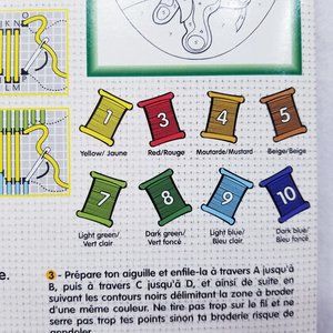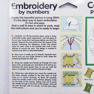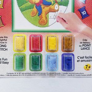 Learn embroidery by numbers kit. Technique is long stitch embroidery. Image is a teddey bear with balloons. Kit includes an 8" x 10" pre-printed numbered canvas, 8 colored threads, 1 needle, and full instructions. For ages 7+ By Color & Co. New in package.