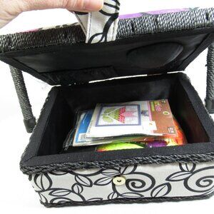 A black and white (and sharpie colored on top) small magnetic closure sewing box that is is good useable condition.
